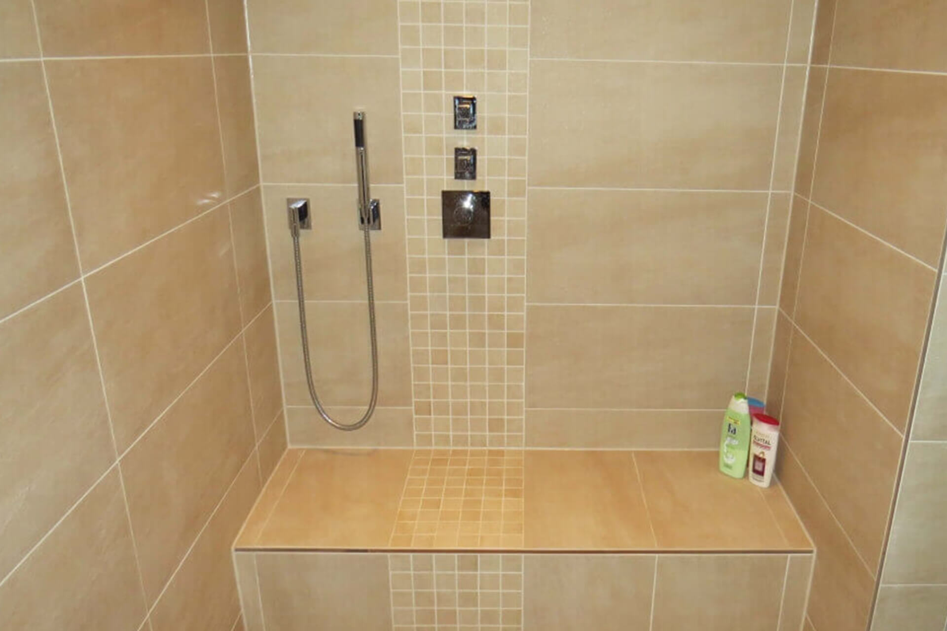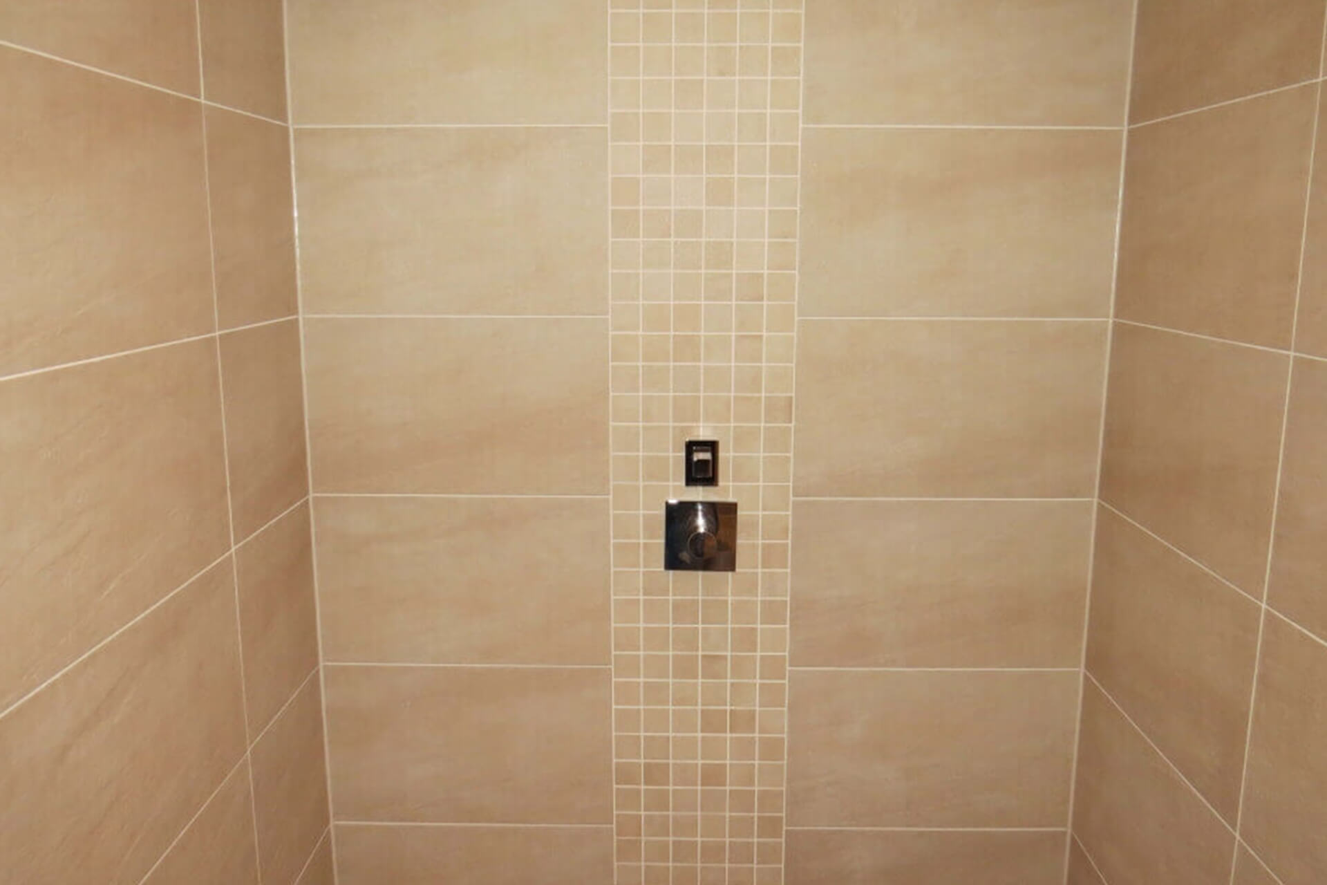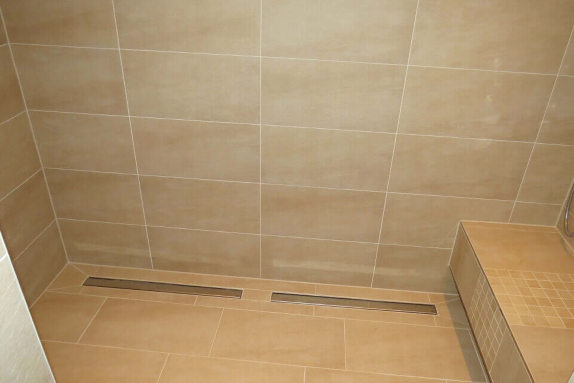 Gefliest wurde Ton in Ton mit gemischten Fliesengrößen.
