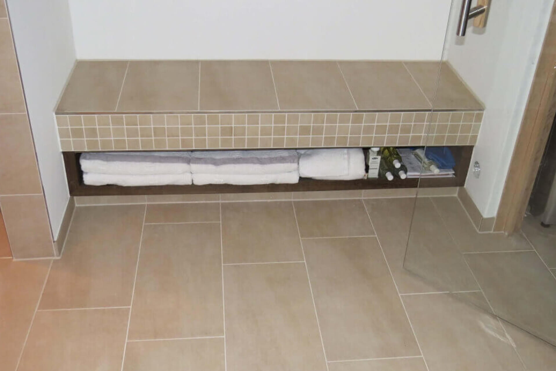 Dieses schöne Beispiel zeigt ein Wohlfühlbad im klassischen Stil mit angeschlossener Sauna. Clever: Die begehbare Dusche hat ein einfaches Podest, das gleichermaßen als Duschablage wie als Duschsitzbank zu nutzen ist. In einer Nische im Bad befindet sich ein Raumoptimierer – oben eine elektrisch beheizte Sitzbank, unten eine weitere Ablage für Handtücher und Co.