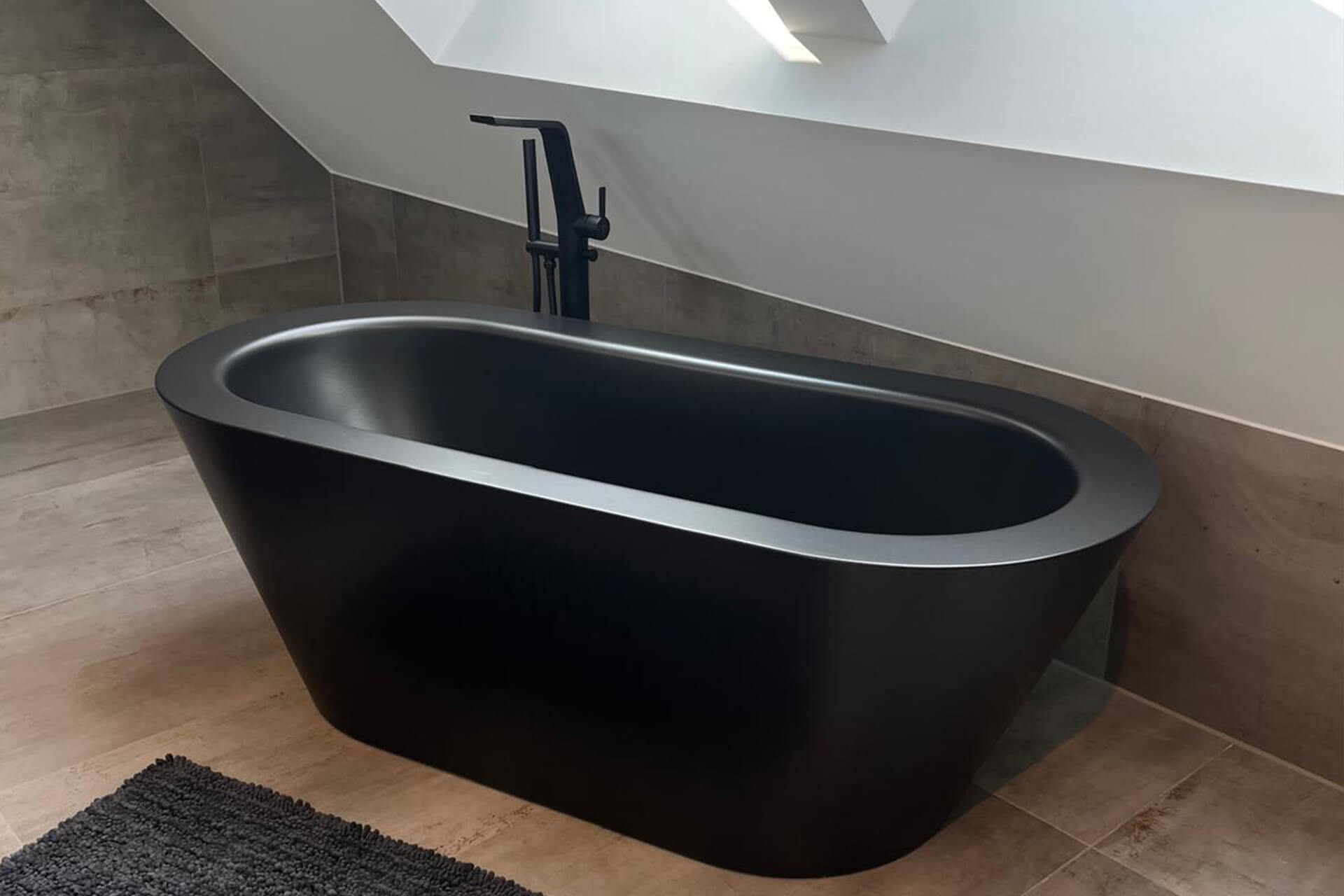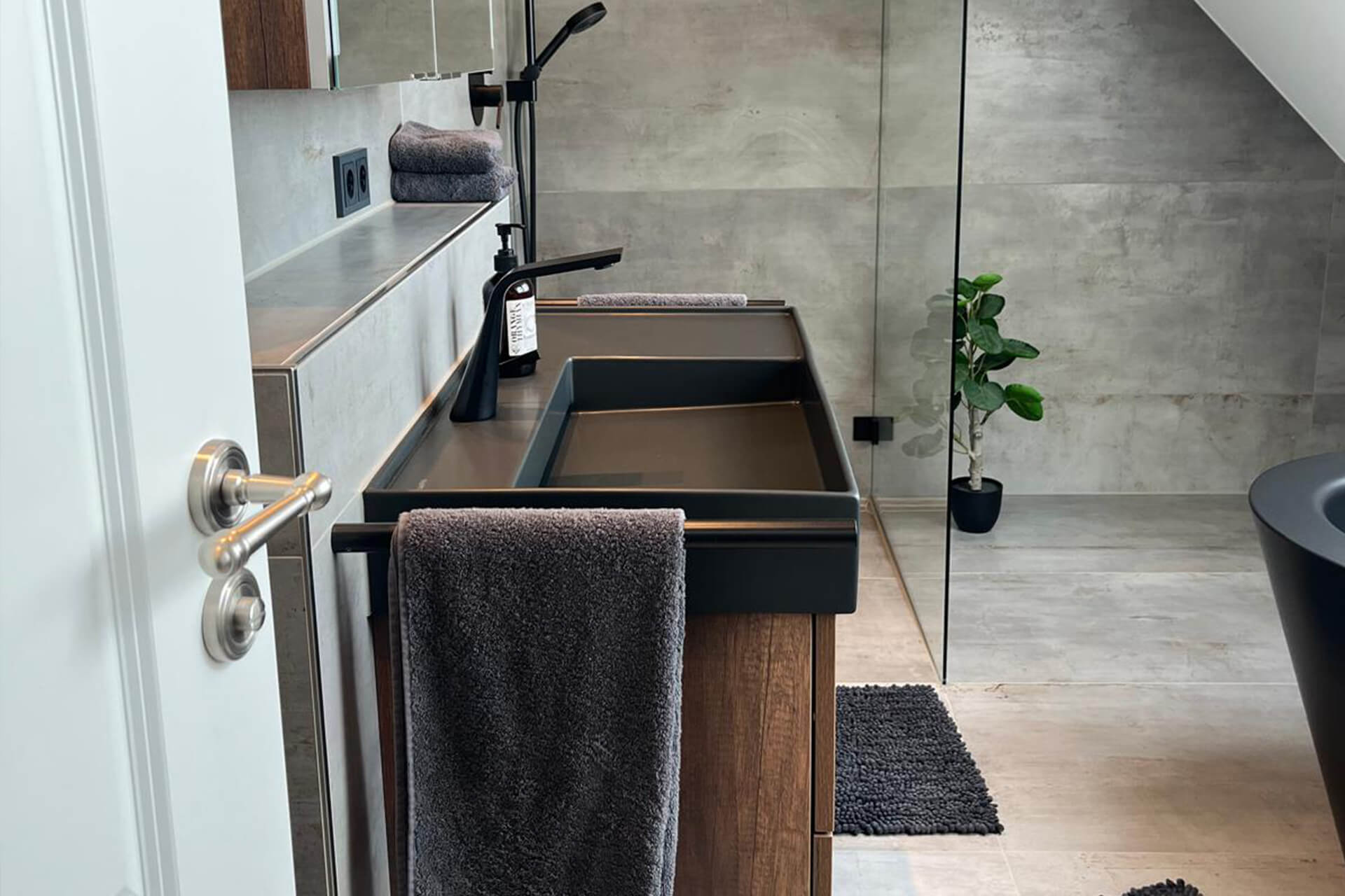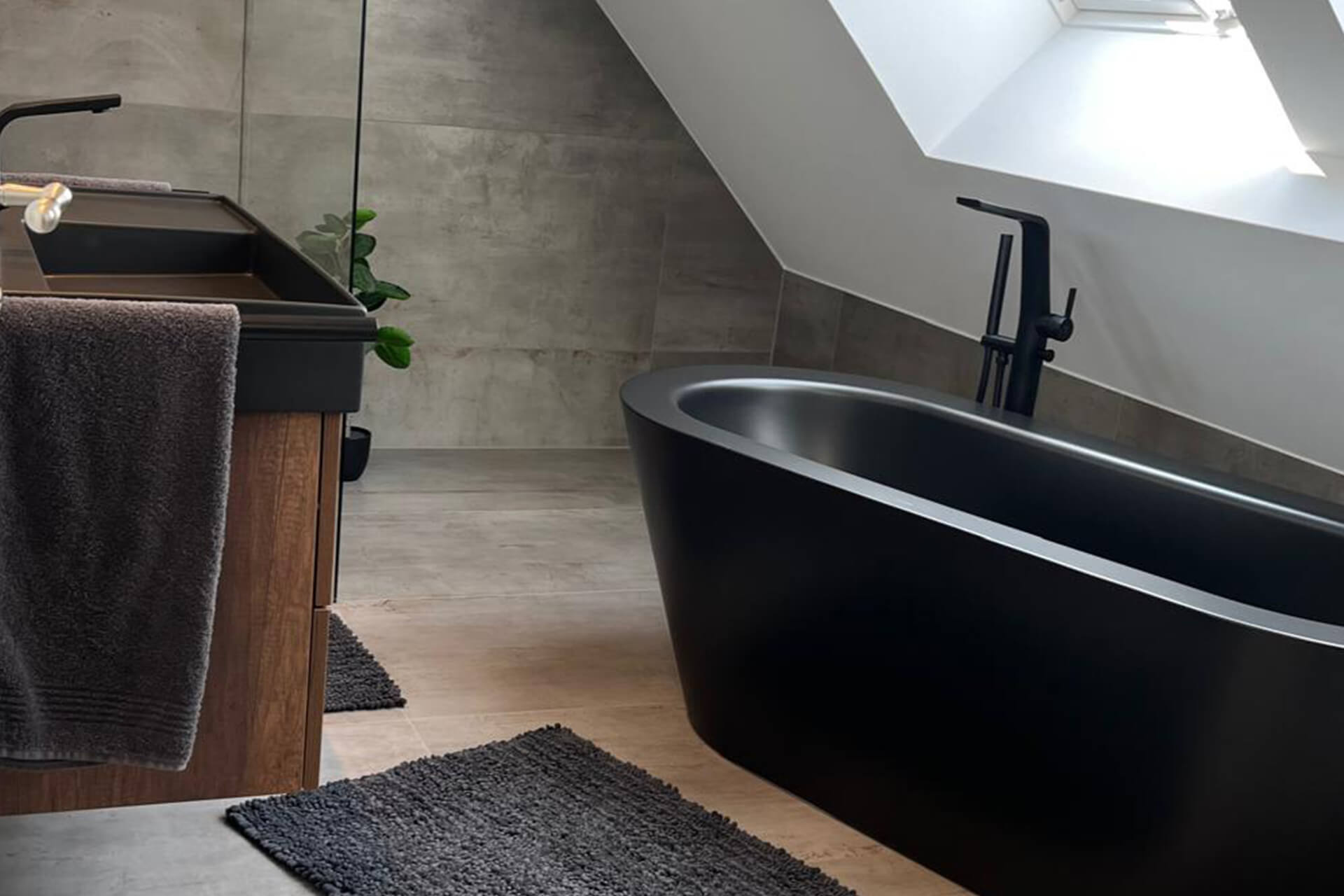 Eine Optik, die nun wirklich keine handwerklichen Fehler verzeiht: Dieses individuell geplante Eigentümerbad mit begehbarer Dusche, freistehender Badewanne und XXL-Fliesen lädt zur entspannten Körperpflege ein. Von ihrem Fliesenlegerfachbetrieb fachgerecht umgesetzt ohne Kompromisse. Nach dem Motto: „Funktion trifft Design trifft Handwerk“.