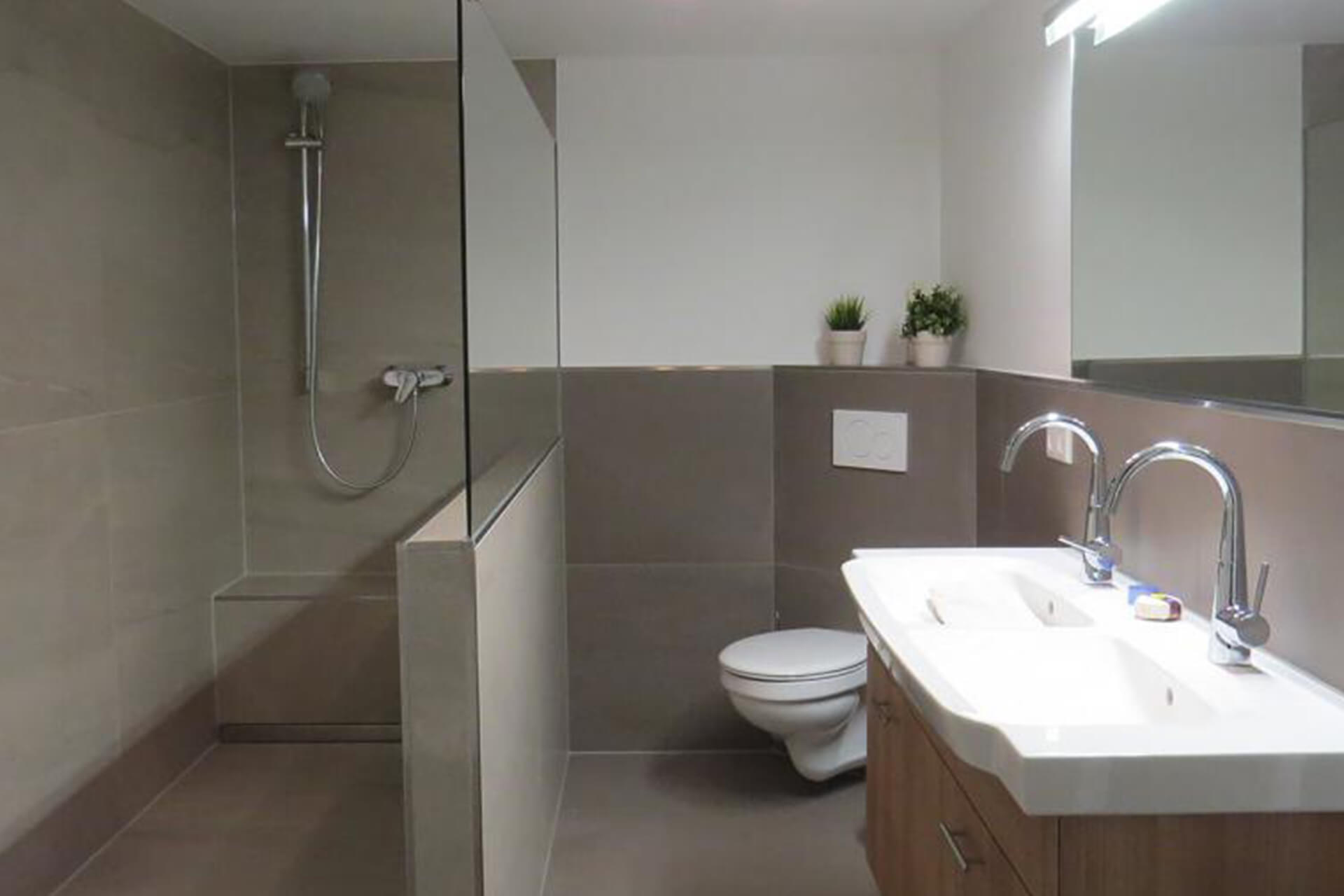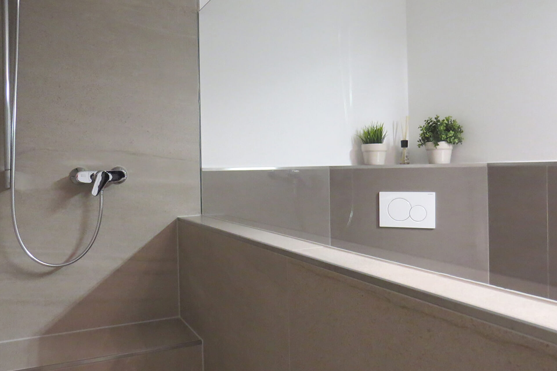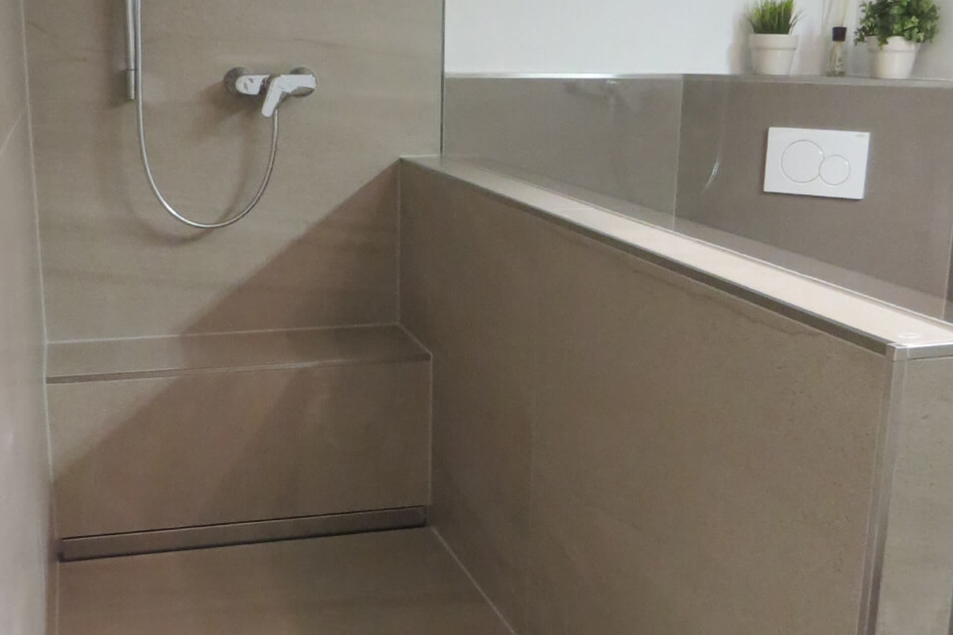 Stichwort Platzwunder: Auf wenigen Quadratmetern finden hier eine großzügige begehbare Dusche mit integrierter Sitzbank, ein lichtspendender Raumteiler mit Glaselement und eine über Eck platzierte Toilette Platz. Hinter der Wand versteckt liegt ein begehbarer Raum zur Wartung der Hebeanlage. Die technische Zusatzausstattung macht dieses kleine, aber feine Bad im Keller erst möglich.
