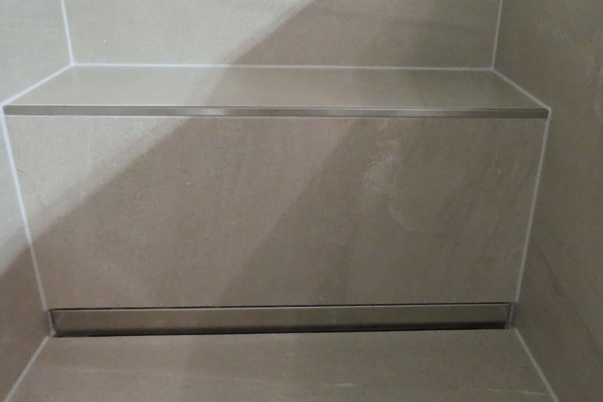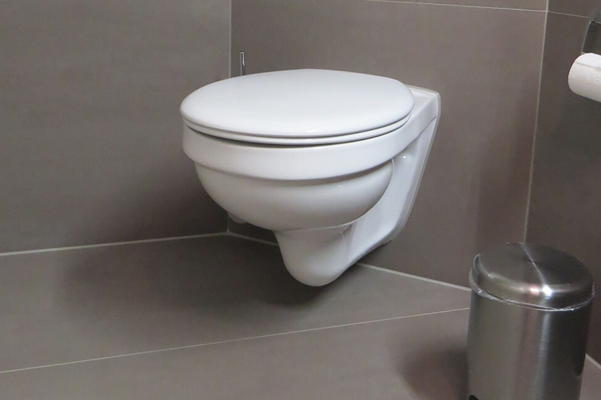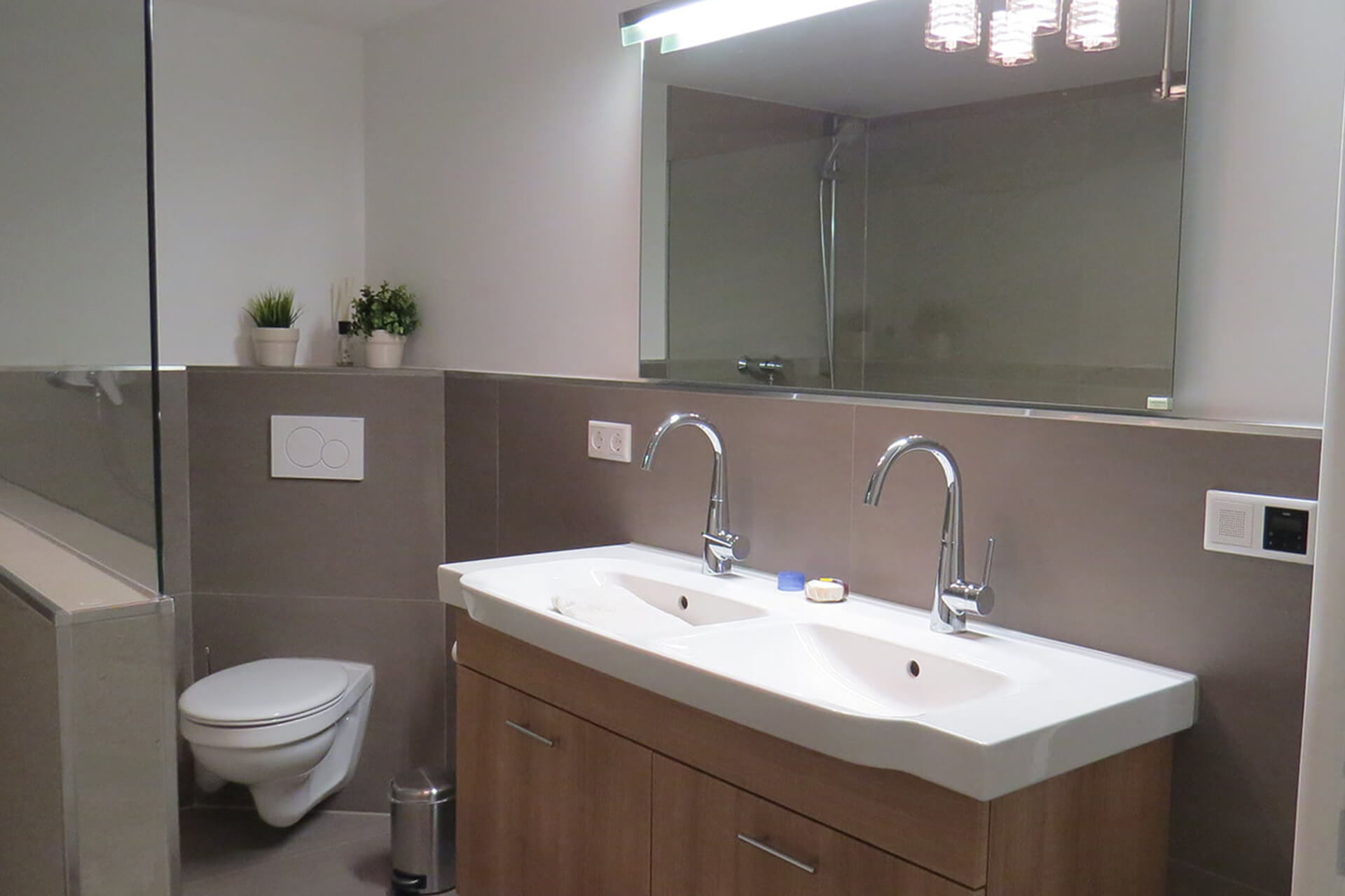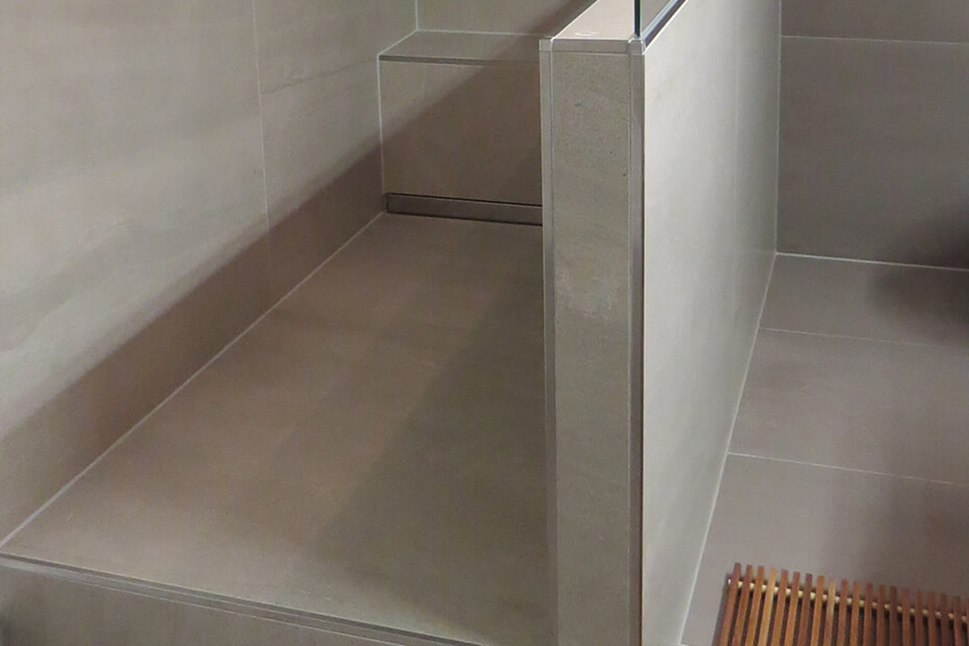 Stichwort Platzwunder: Auf wenigen Quadratmetern finden hier eine großzügige begehbare Dusche mit integrierter Sitzbank, ein lichtspendender Raumteiler mit Glaselement und eine über Eck platzierte Toilette Platz. Hinter der Wand versteckt liegt ein begehbarer Raum zur Wartung der Hebeanlage. Die technische Zusatzausstattung macht dieses kleine, aber feine Bad im Keller erst möglich.