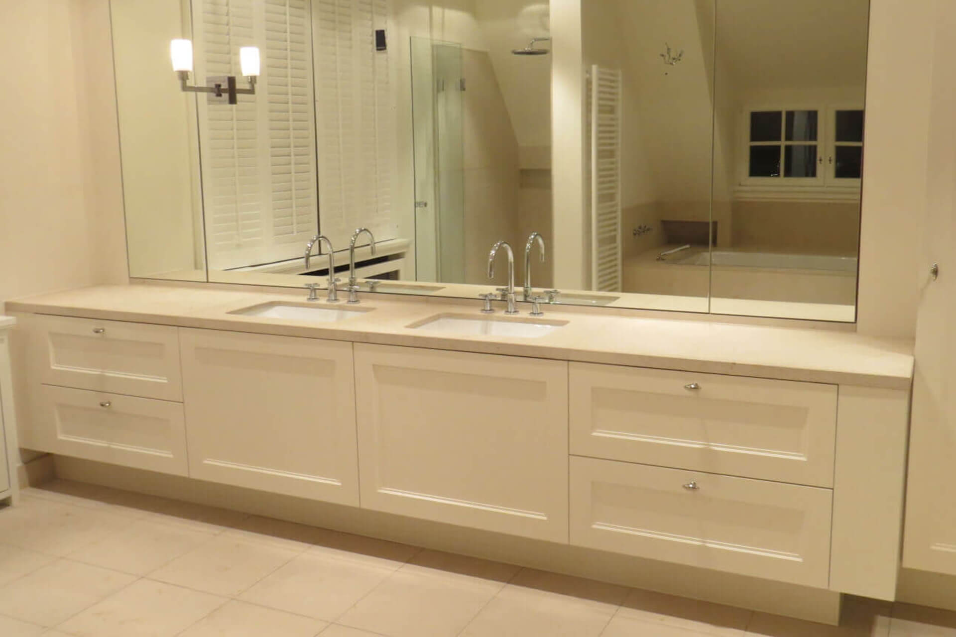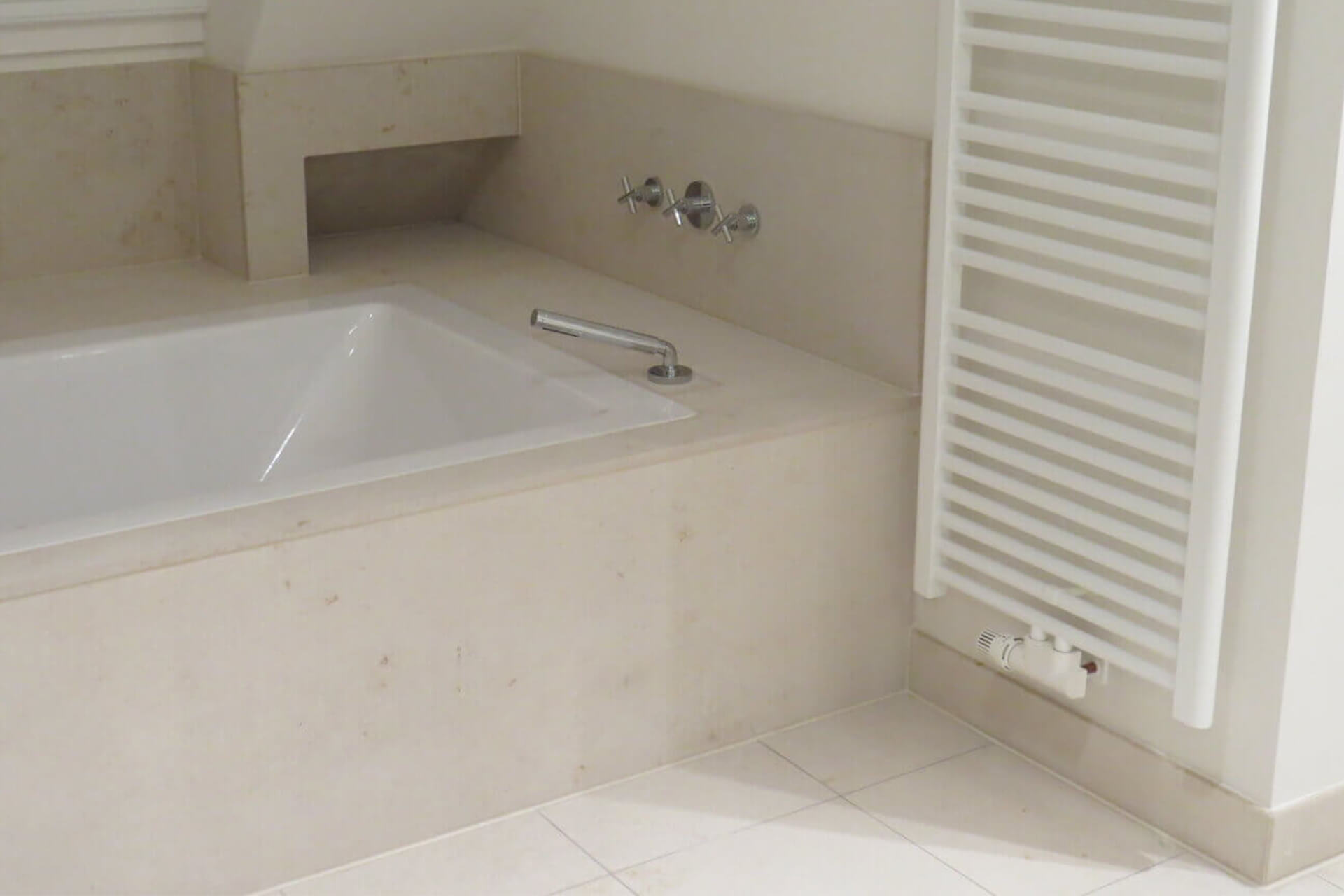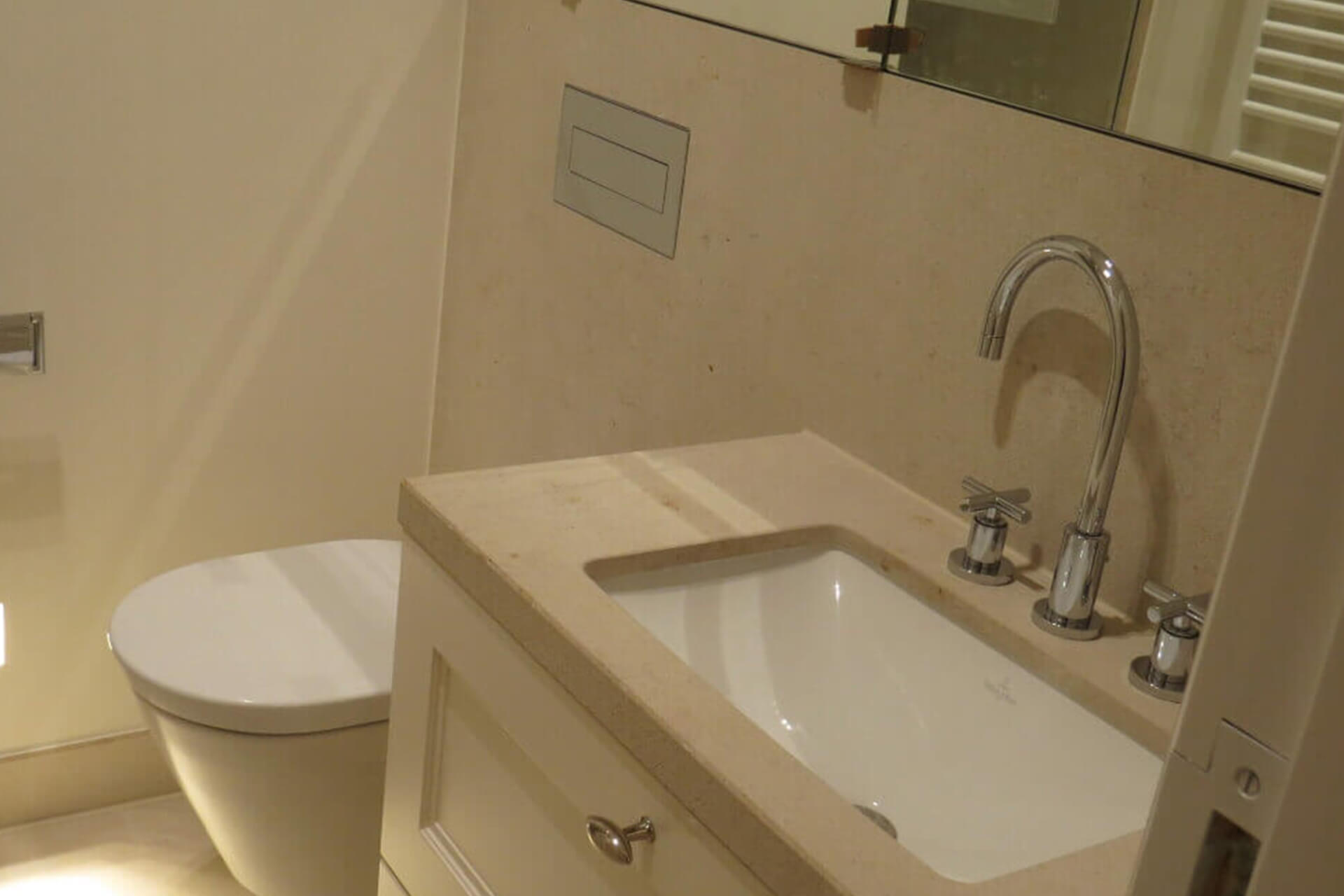Oh, là, là, das Bad hat es in sich. Wer genau hinschaut, erkennt die fugenlosen Steinplatten an Waschtischen, Badewanne und allen Wänden. Verarbeitet wurde aus einem Stück geschnittener offenporiger Naturstein, der eigens individuell angefertigt und vor Ort zusammengesetzt wurde. Diese anspruchsvolle Aufgabe konnten wir dank unserer Expertise in Naturstein und der Verarbeitung sehr großer Platten zügig und fachgerecht realisieren.