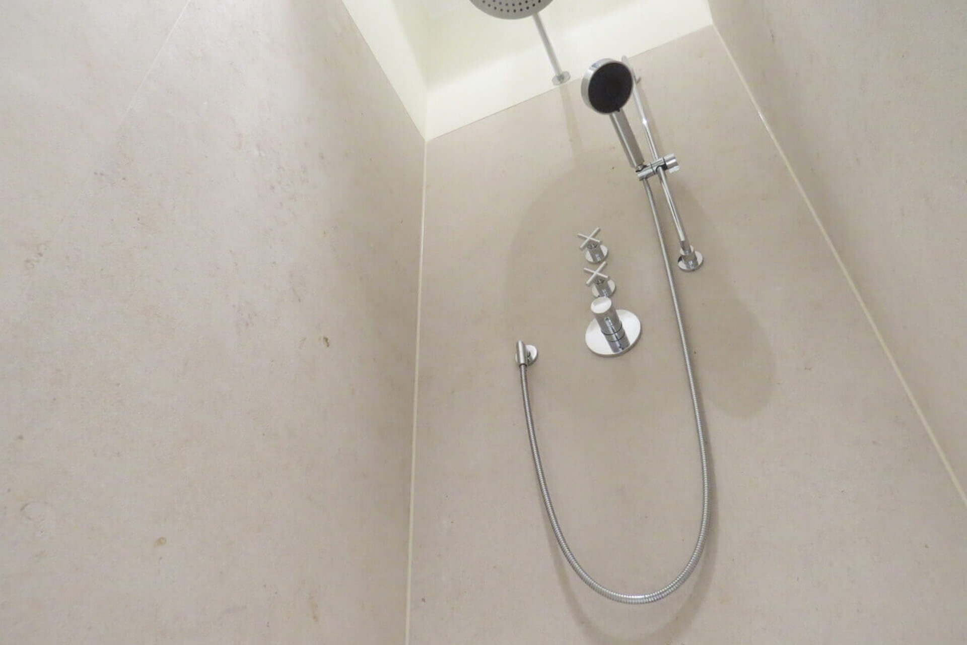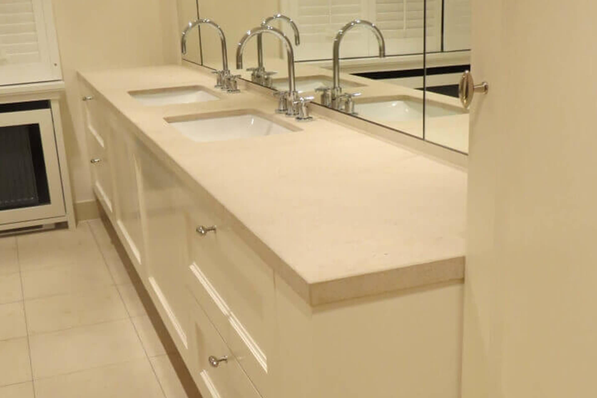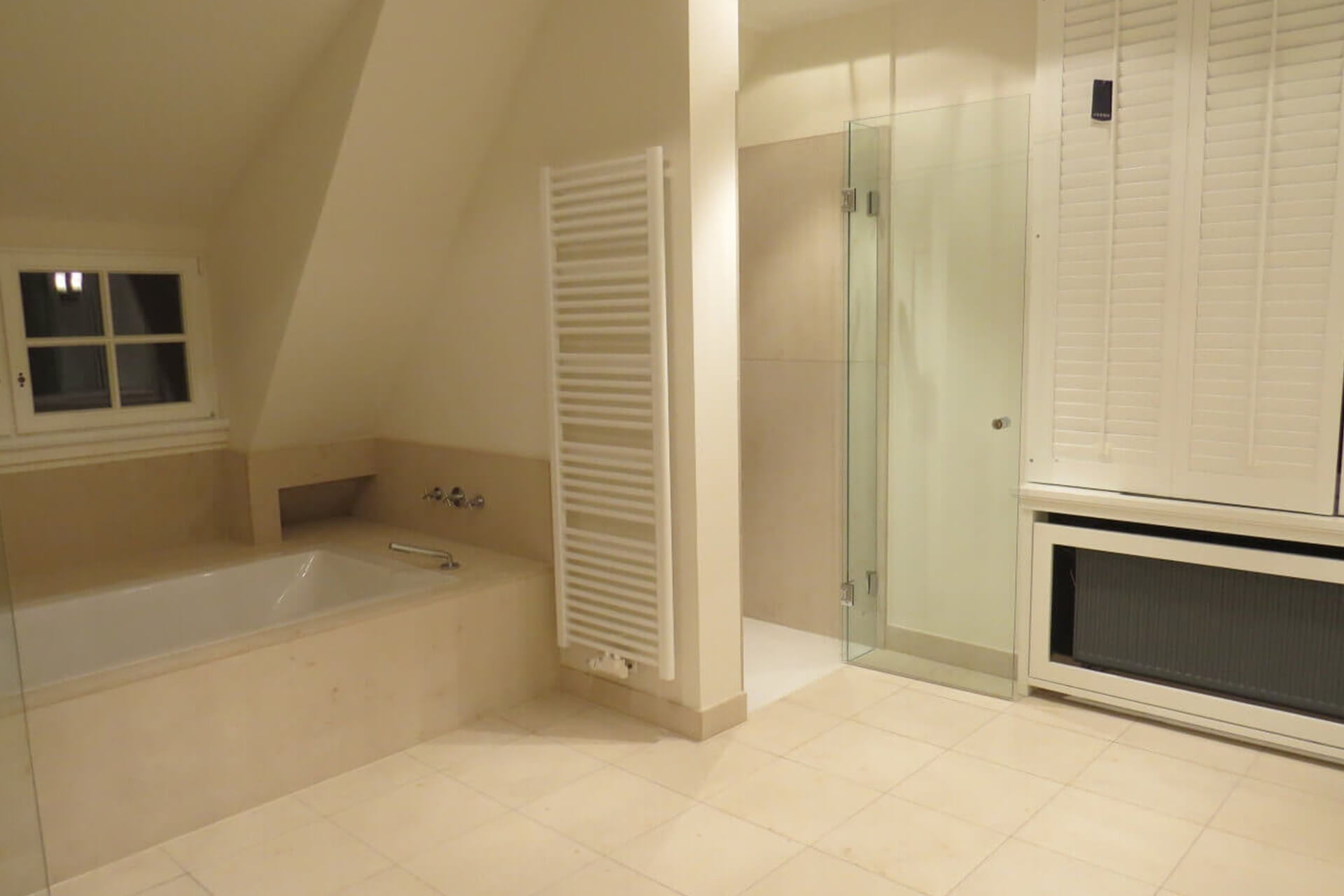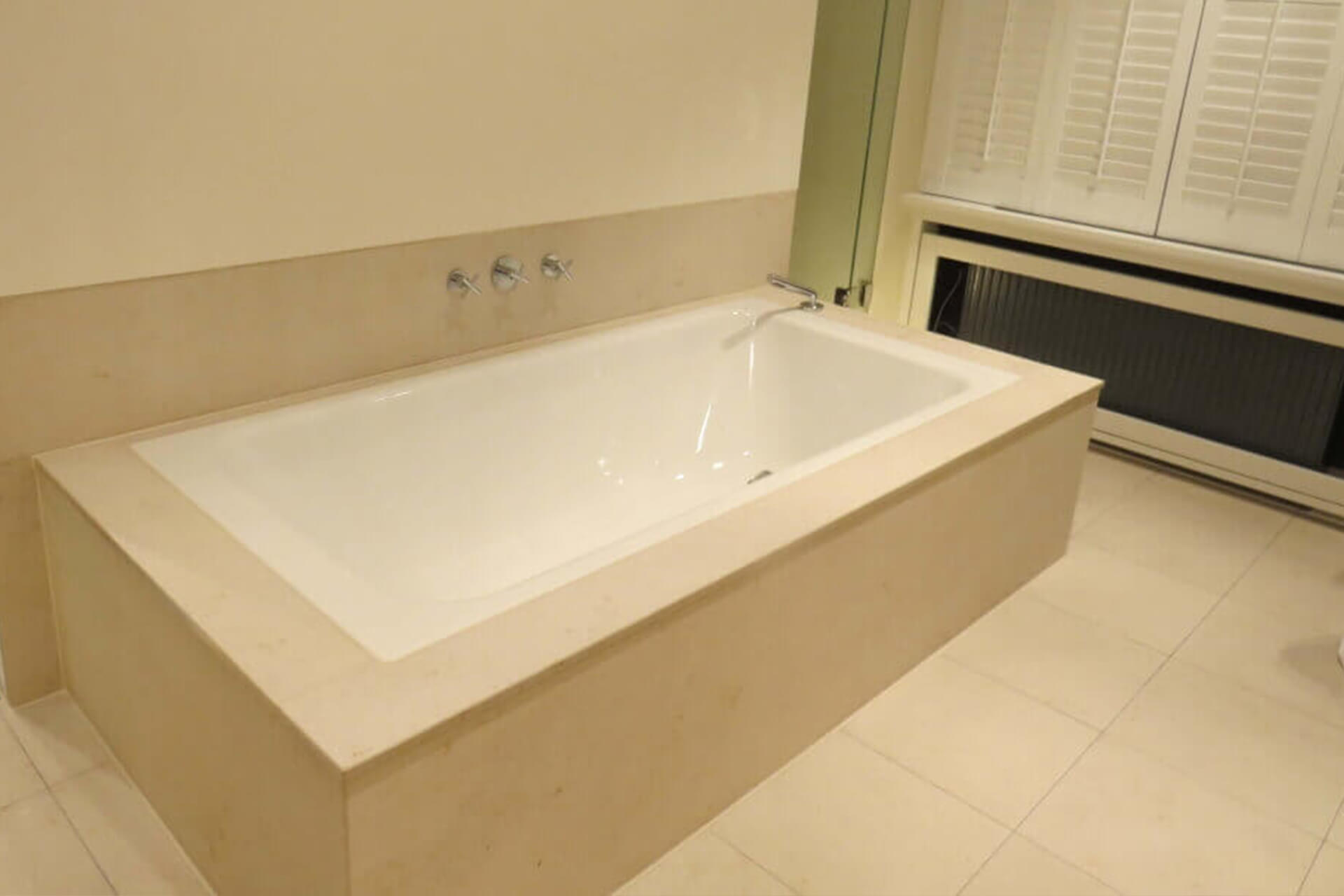 Oh, là, là, das Bad hat es in sich. Wer genau hinschaut, erkennt die fugenlosen Steinplatten an Waschtischen, Badewanne und allen Wänden. Verarbeitet wurde aus einem Stück geschnittener offenporiger Naturstein, der eigens individuell angefertigt und vor Ort zusammengesetzt wurde. Diese anspruchsvolle Aufgabe konnten wir dank unserer Expertise in Naturstein und der Verarbeitung sehr großer Platten zügig und fachgerecht realisieren.