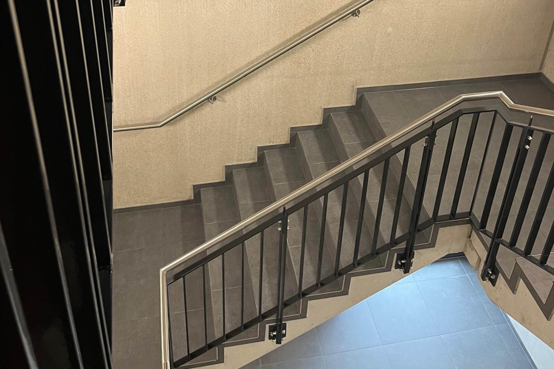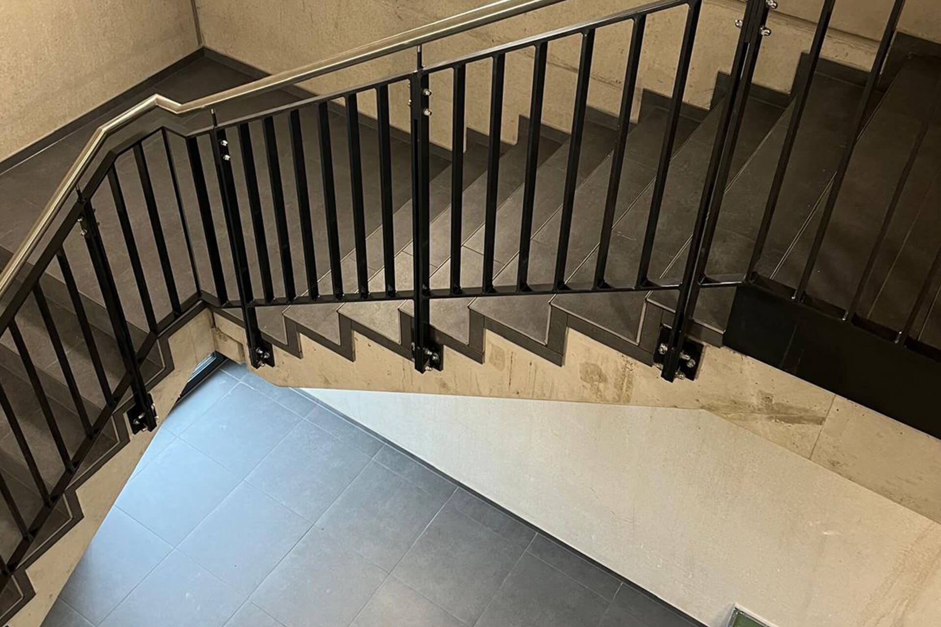 Die Fliesen auf Stufen und Podesten im neuen Treppenhaus der Sportschule in Bielefeld wurden von uns perfekt im Fugenschnitt verlegt. Das Zusammenspiel von Fliesen und Fugen ergibt ein ruhiges und gleichmäßiges Bild. Dabei harmoniert der Farbton Anthrazit mit dem robusten Rohbeton der Wand. Leichte Verschmutzungen können dem tadellosen Gesamteindruck nichts anhaben. Material und Optik wurden sorgsam ausgewählt und lassen kleine Krümel und leichte Fußabdrücke optisch einfach verschwinden. Nach dem Motto: Wie Sie sehen, sehen Sie nichts.
