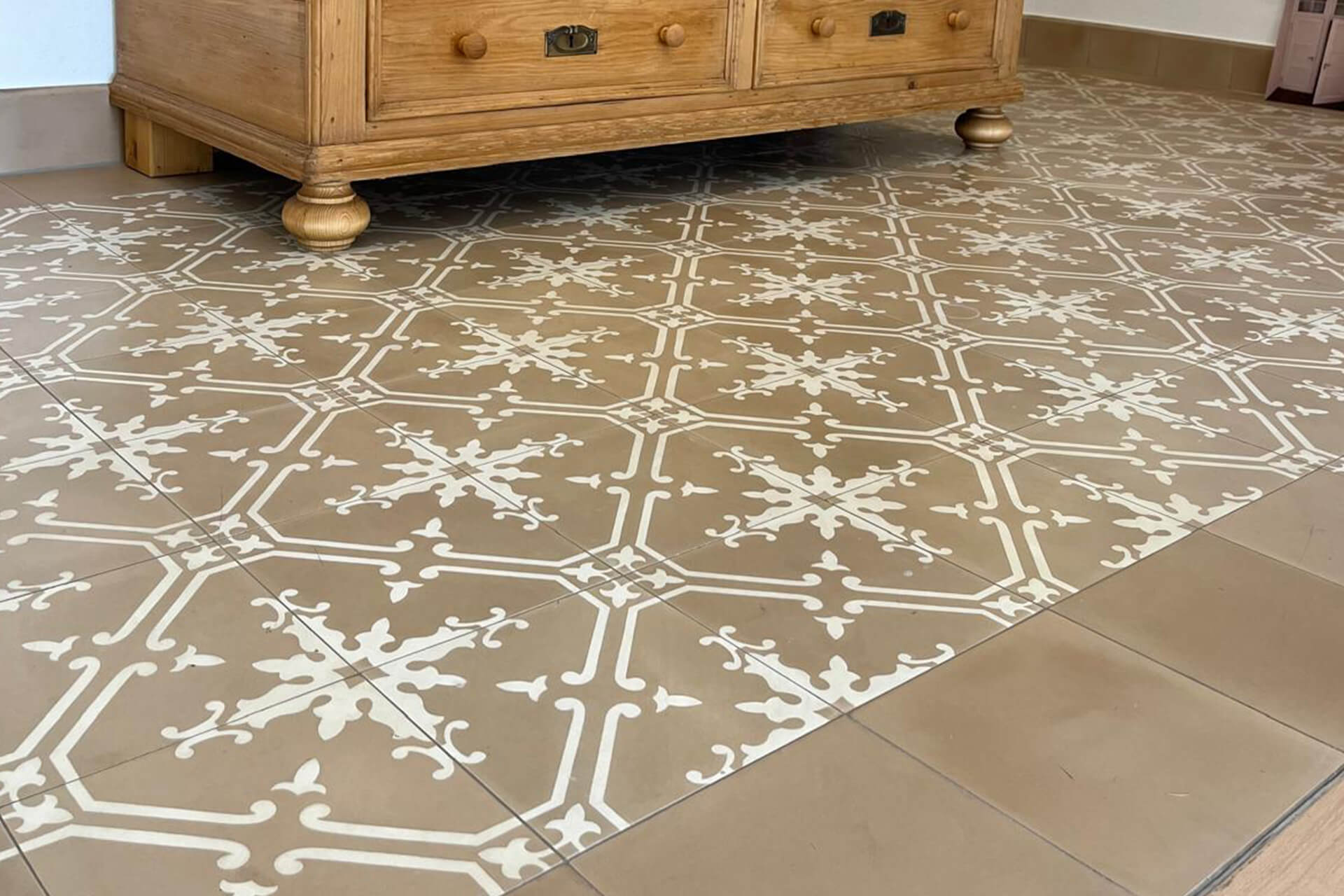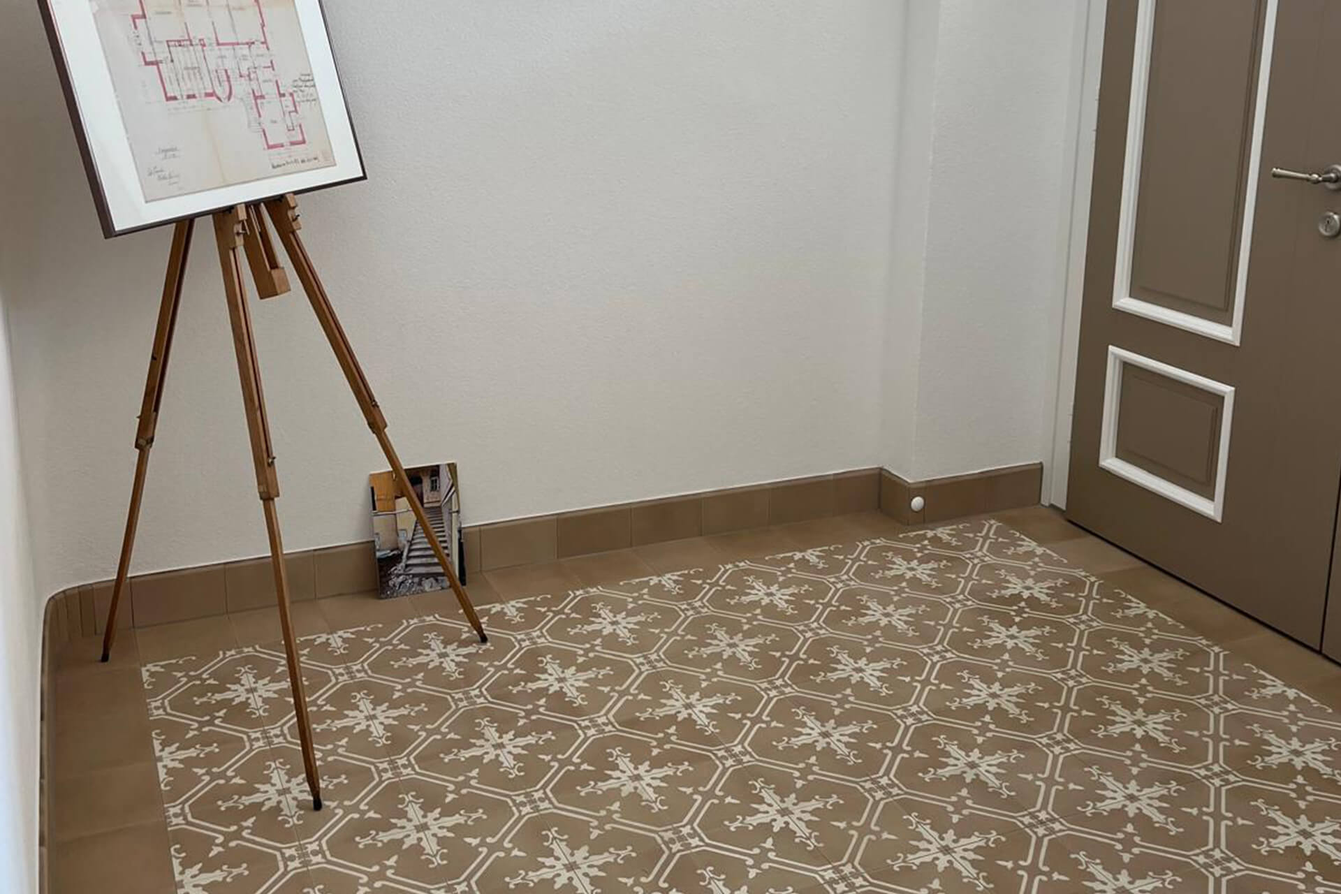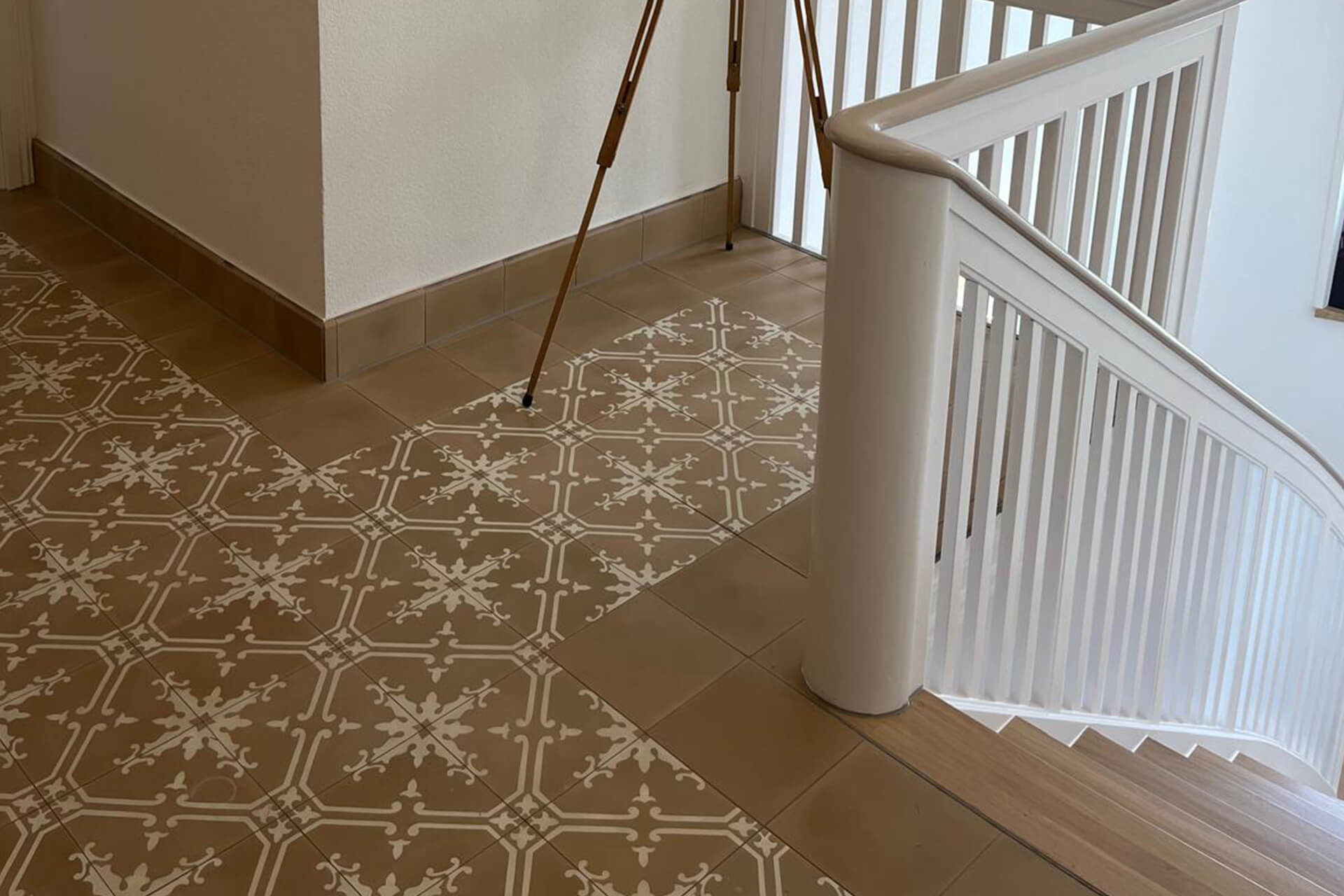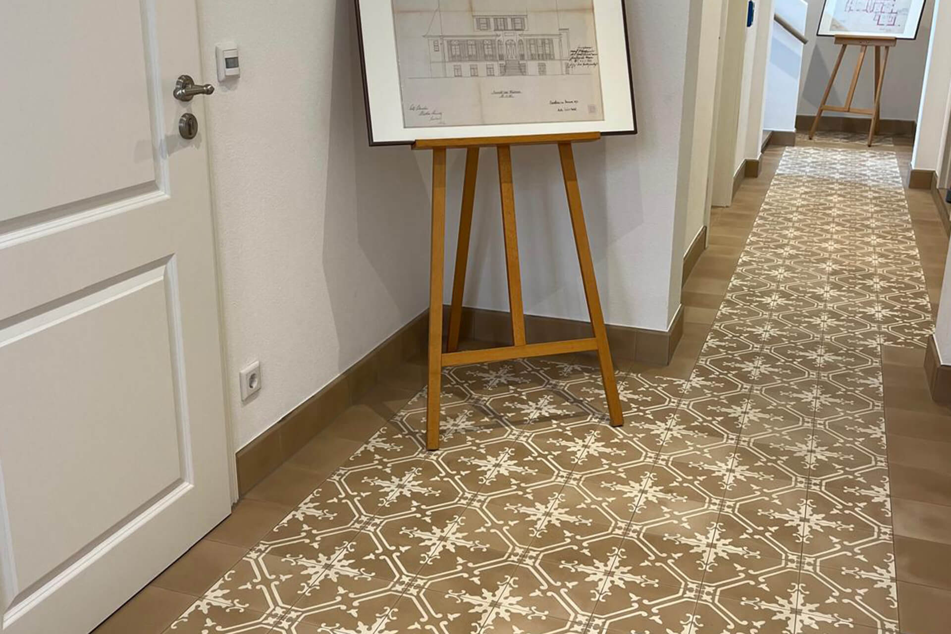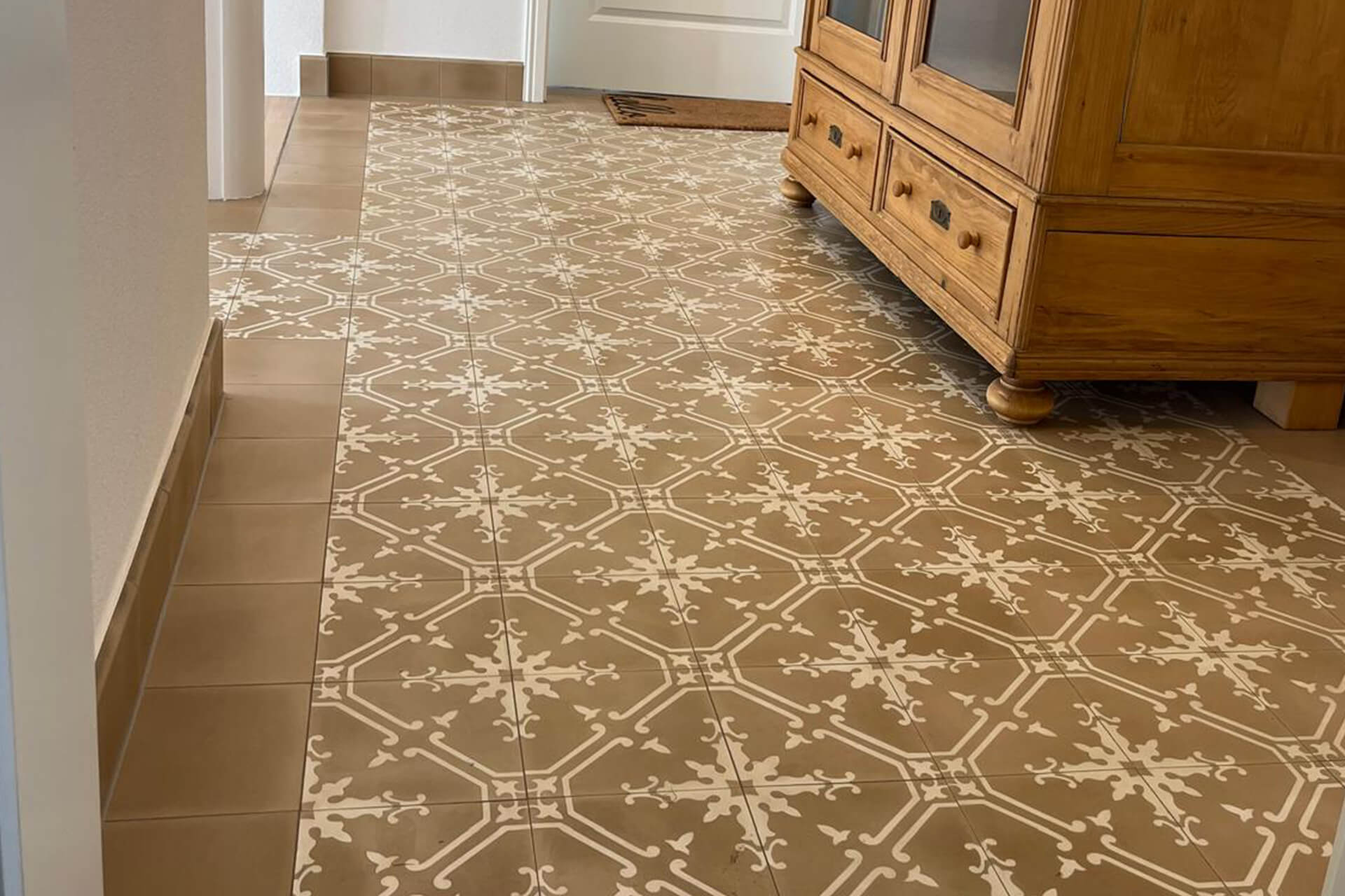 Besonders gut kommt ihr Bodenbild zur Geltung, wenn Sie es mit einer passenden unifarbenen Zementfliese umfassen. Unser Beispiel zeigt eine Flursituation mit zweifarbigen Musterfliesen in Kombination mit einfarbigen Bodenfliesen. Abgerundet wird das Bild mit einer umlaufenden Sockelfliese Ton in Ton, die den Boden stilvoll abschließt und die Wand vor Schmutz und Beschädigung schützen soll. Wand- und Türgestaltung greifen die Farbgebung der Bodenfliesen wieder auf.