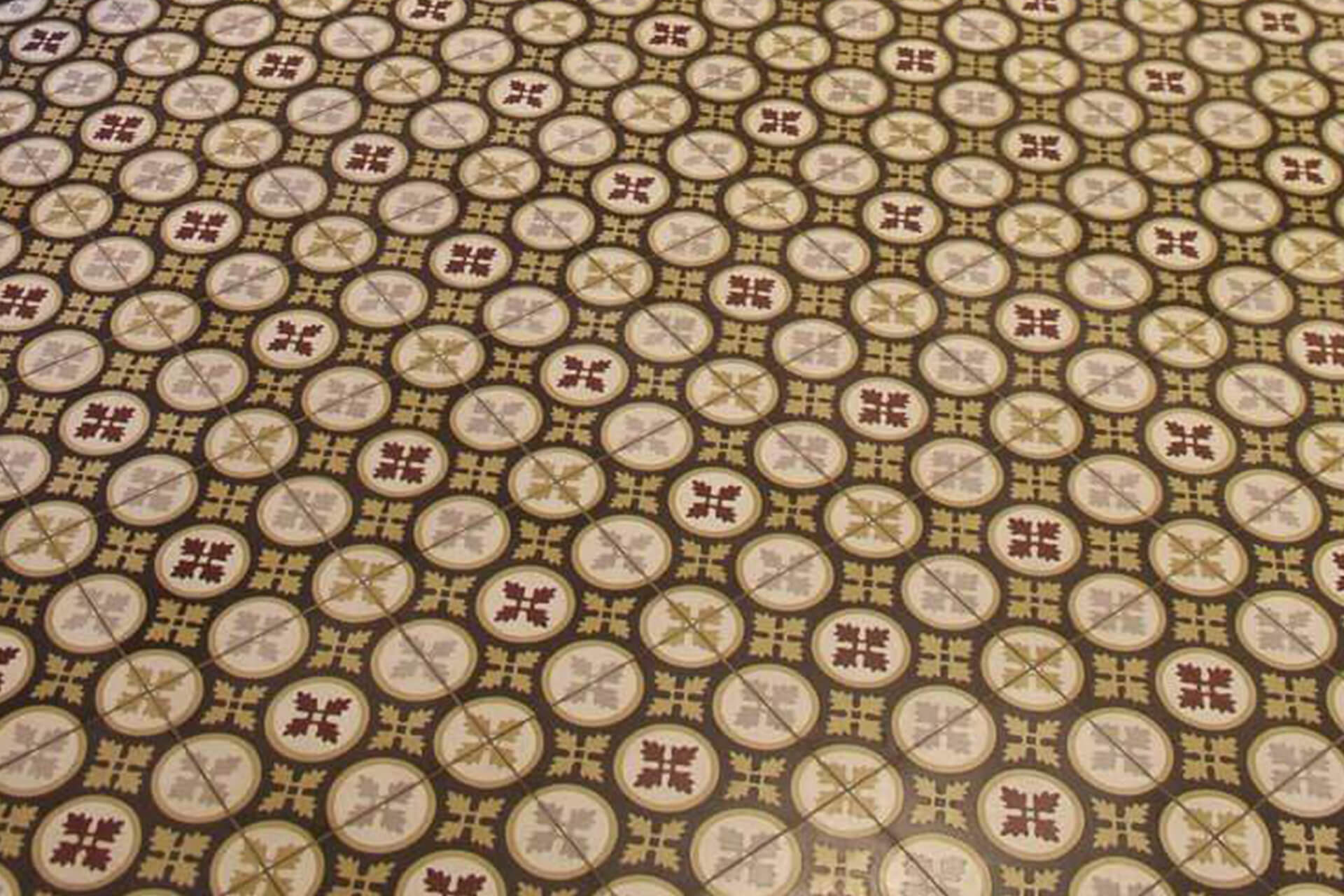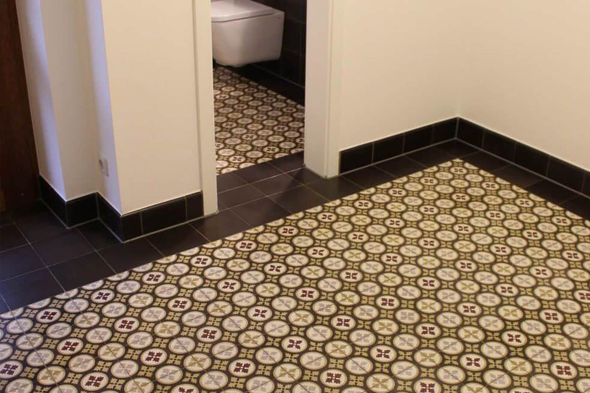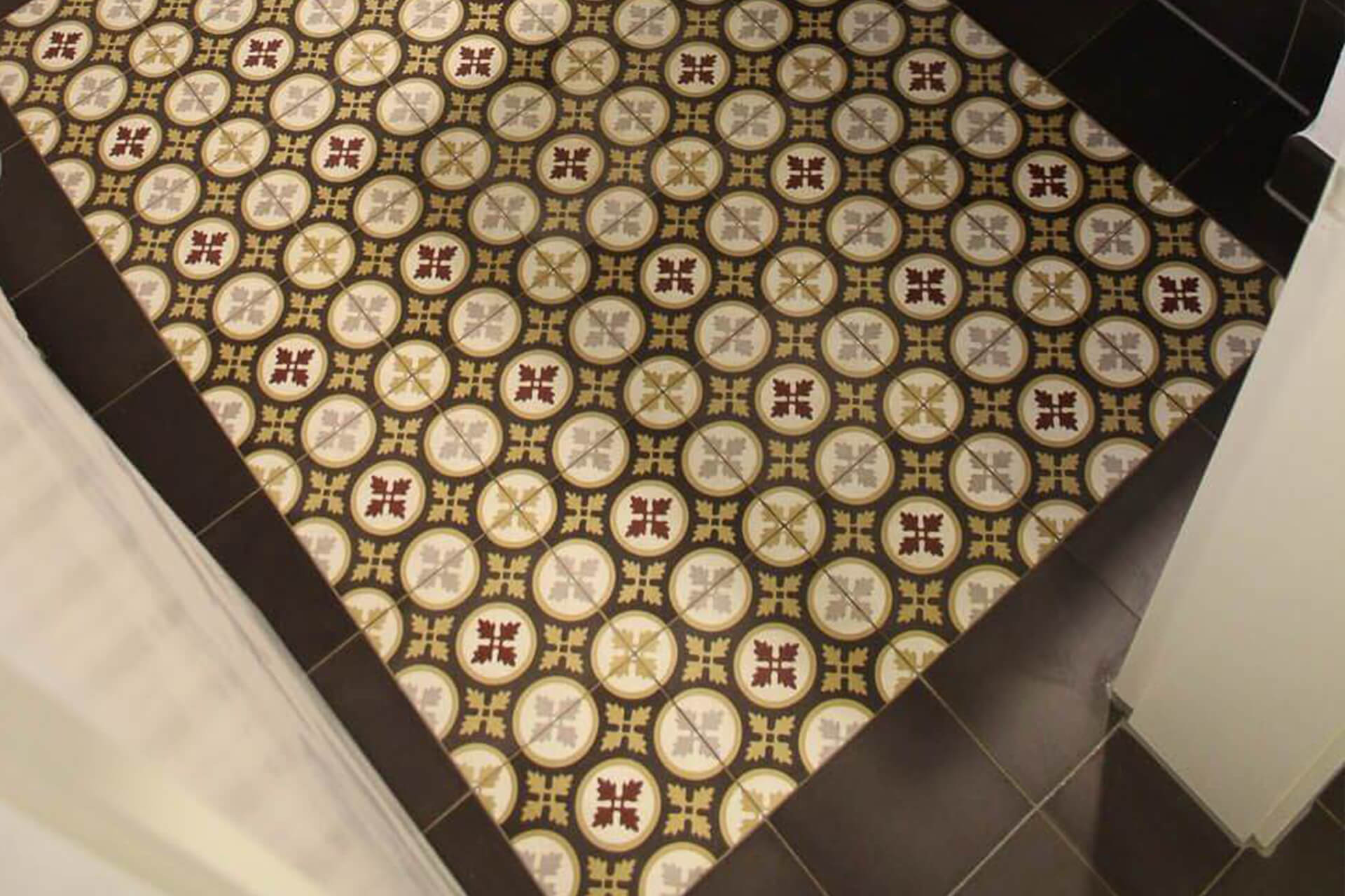 Die Verlegung der Zementmosaikplatten erfolgt in einem engen Fugenbild, das anschließend mit einem Gemisch aus Quarzsand und Trasszement verfugt wird.